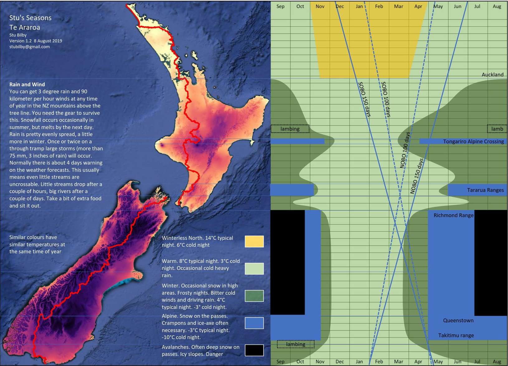 But have a look at this clever map and chart by Stuart Bilby. Print it out and chose your speed from between the super fast 100 days for the whole TA or the slower 150 days. I reckon 130 days might be reasonable (this includes about 5 non-walking days). And run a ruler parallel to either option, or somewhere between, and try some different start dates to work out missing the dark green and blue bits. Or plan around them: The Tongariro Crossing by no means necessarily has snow in April, and it is a one-day hike that is easily skipped. Ideally a rain chart could be superimposed over this as well.