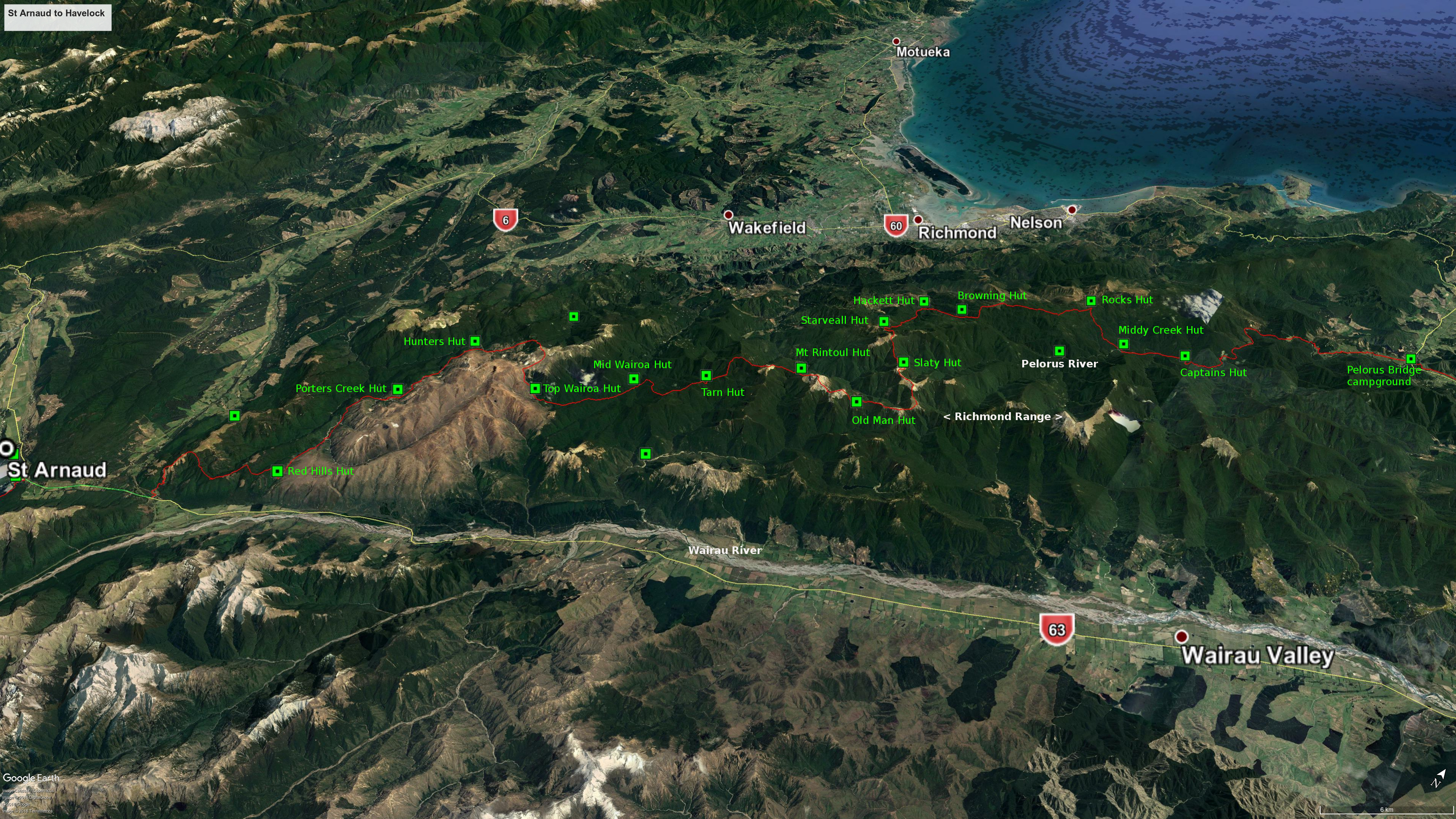 However, you may wish to do the new route, as per the map, which involves turning off left on Tophouse Rd and taking the track off its right after about 700m. This is about 1 km less road walking than the 5 Mile Scenic Reserve option above, but involves a steep climb to peaks at 1,100 and 1,200 m (with great views) up a mountain bike track, and is 3 km longer, so it would probably extend the St Arnaud to Porters Creek Hut time to 10.5 hrs. You might choose to go only as far as the Red Hills Hut on the first day. Then go to Hunters Hut (8.5 hrs) the next, and to Top Wairoa Hut (9 hrs) after that, or just to Mid Wairoa Hut (5 hrs) after Hunters.