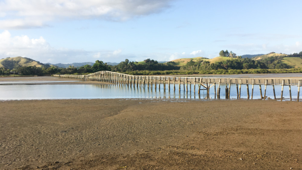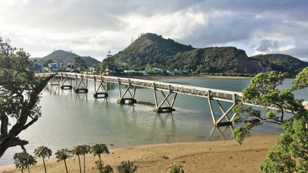 The walkway ends as a well-graded farm track/driveway lined with pōhutukawa trees, going over a stile and behind private baches. You exit past Pitokuhu Point onto Pukekawa Rd back from the next beach. Continue on this to cross the spit to the southern shore of Whananaki Inlet and walk west along the water’s edge to the footbridge and cross over what is claimed to be the longest footbridge in the Southern Hemisphere. If the tide is high on the above-mentioned shore you should detour beforehand by taking the road going west from Whananaki South as property owners have strung an electric fence wire along their frontages to the water. Over the bridge a short way to Whananaki North Rd on the right are public toilets, and further on are the Whananaki Holiday Camp and a store.
