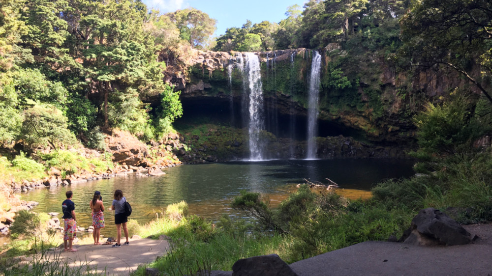 Follow the path inland along the northern bank of the Kerikeri River on the Kerikeri Walkway that starts at right straight after the bridge by Kemp House. You will pass the remains of a powerhouse built as part of a hydro-electric scheme that operated from 1930 to 1967, and past the 27m high Rainbow Falls that tumble over basalt lava fields which flowed into the river valley during long past volcanic eruptions. The track comes out onto a large grassy area. Turn left and continue following the river. You end at a drive, and go across it on a track that leads to a roadside rest area by SH10 with a gazebo and picnic table.