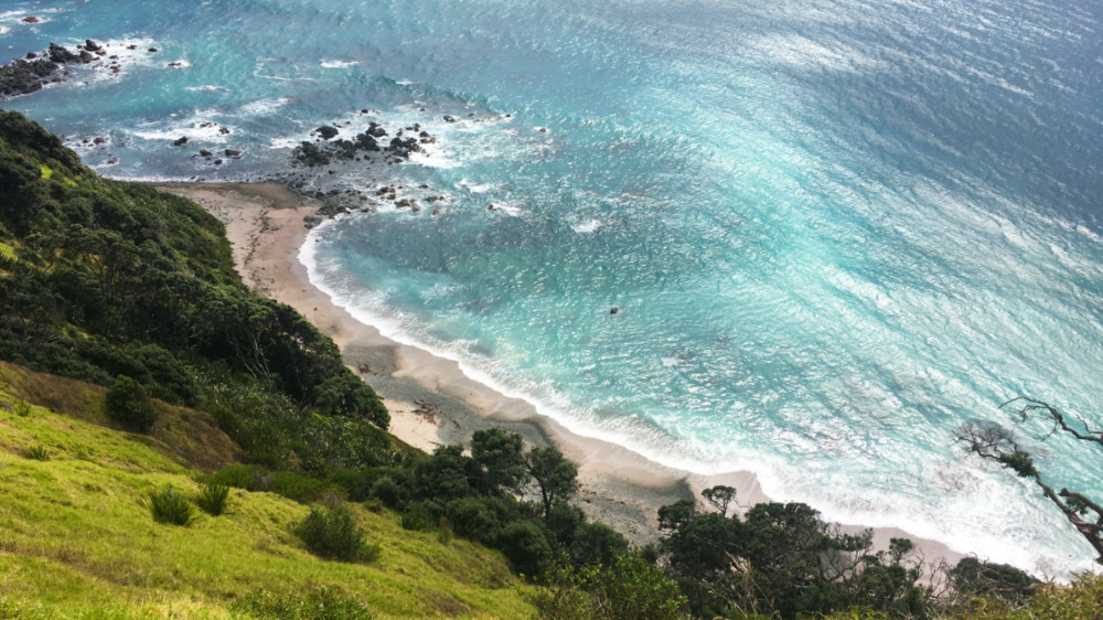Walk north along the beach. You first have to climb up sand on the side of a promontory to get to the next beach. There is a short bit of track at the top to the leftthat leads to a spot that makes it easier to get down the other side. The dunes along the beach are a wildlife sanctuary, so avoid entering here. No dogs are allowed due to nesting birds. It would be best to walk at low tide so you don’t need to go near the dunes. Check the NIWA tide tables.