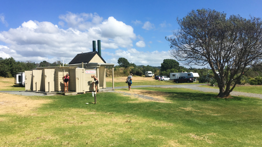 - Treasure Island campground – 60 Mahanga Rd, Pataua South, about 500m east of the trail at Pataua. 09 436 2390, 021 0266 8021. Discount for TA walkers. Not usually open in winter months, and the basic supply shop is only open for 6 weeks over the peak summer period, with takeaways offered until 6pm weekdays and 7pm weekends. This does not seem to be a highly popular campground and you may find no-one around (neither campers nor management). Note that the showers in the two-story toilet/shower and kitchen block require a 50c piece to yield hot water.