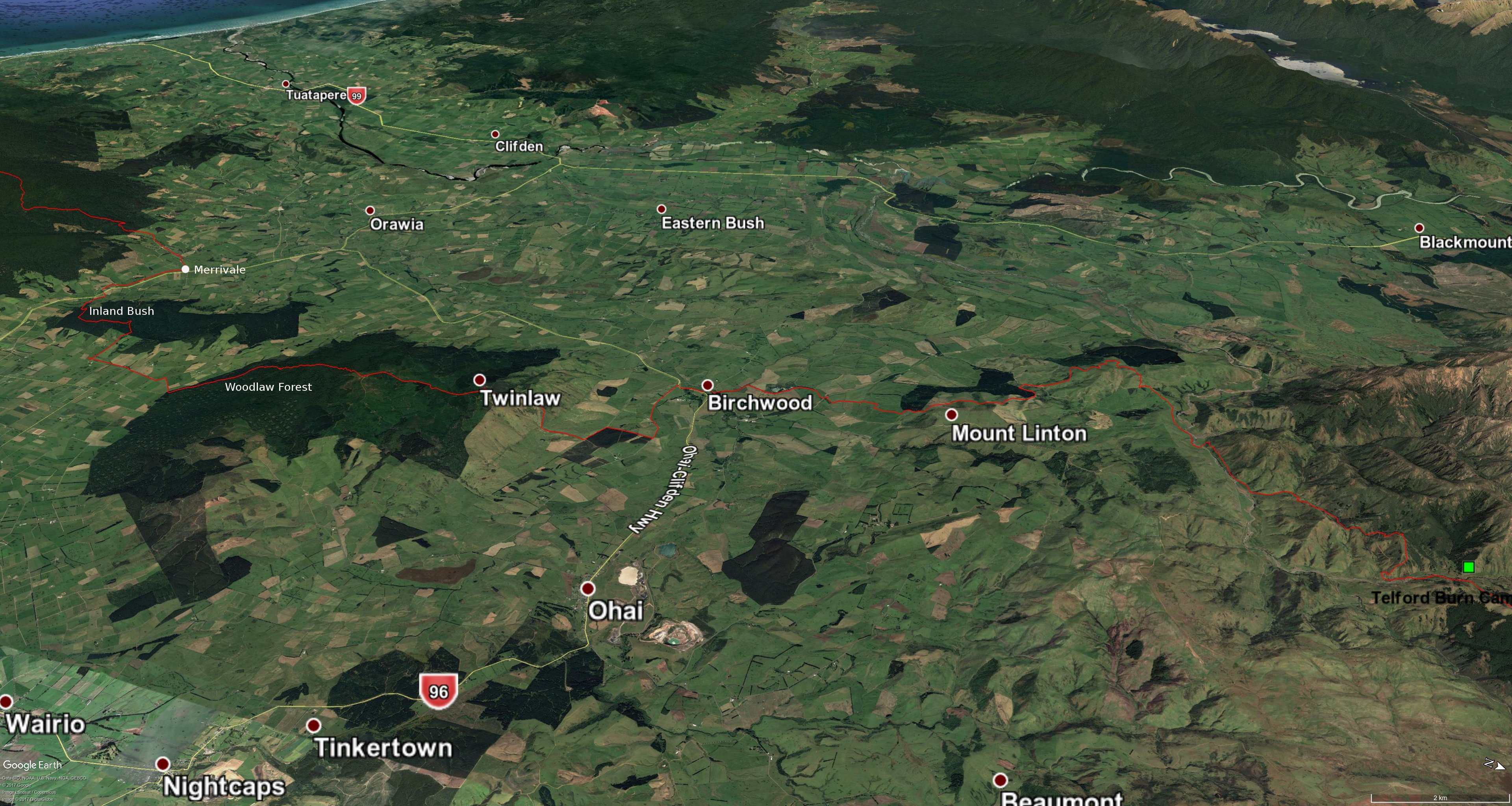 It is a very hard climb above Telford Burn. The markers seem to suggest you go into the bush on the way up, but ignore that. Begin on the opposite side of the fence line from the campsite and you will find markers further up: keep going straight up whether you can see the markers or not. The climb to and along the Telford ridge tops is very exposed and would not be safe in a storm. The highest point is 1024m. On the other hand, the descent down the other side is through the Takitimu forest and is easy going. The exit from the tops into the forest is well marked.
