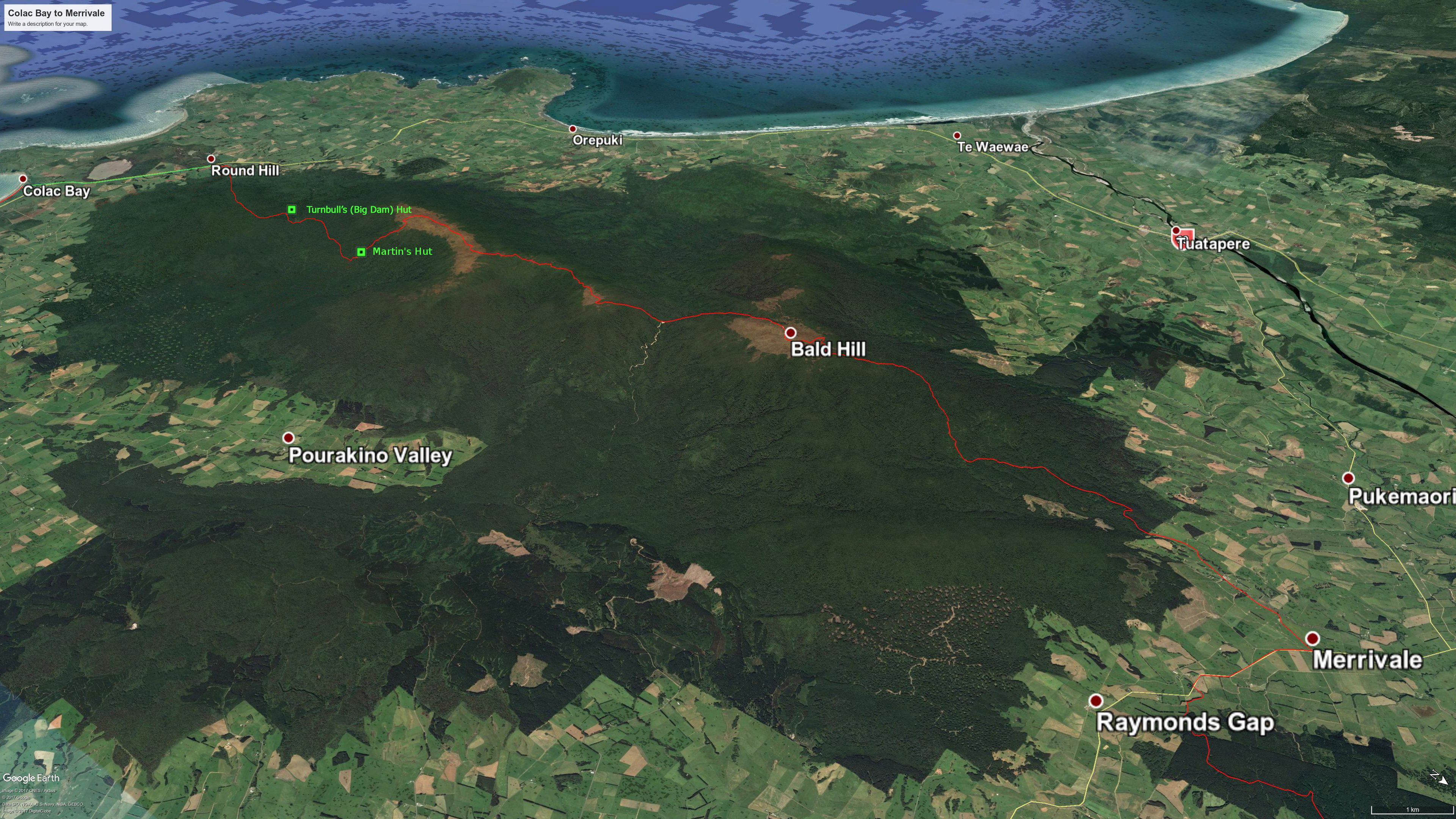 The rest of the track continues to the Merrivale Rd end. There are several options now for a place to sleep. One is camping: there is room for about one tent where the track exits from the trees onto farmland, but there is no water source. Dense vegetation either side of the road makes camping in the area difficult in general. However, you can continue down the road until you reach another road coming in from the right. A short distance down this there are flat patches on the margins of the road that will take a tent at a pinch – just before a substantial stream that crosses the road. A much better option is to arrange accommodation at Merrivale Hut, 5km downhill at the intersection of Merrivale Rd and the main road between Otautau and Tuatapere. Or you could hitchhike to either of these settlements. Tuatapere is about 26k to the west, Otautau 16k to the east. However, this will make for a very long day, and traffic may be very light if you reach the road during the evening.