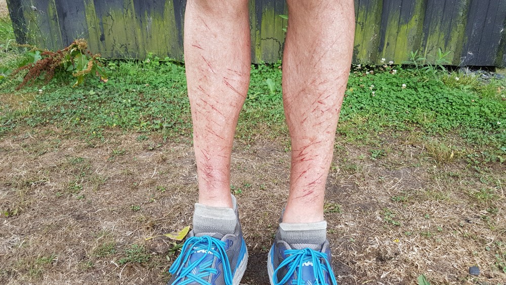 You begin by passing through farmland then a pine and eucalyptus forest. The track is overgrown with blackberry, but it is not too bad compared with what is to come. Then you follow a rough and poorly marked track along a stream. After a little over an hour the orange markers change to yellow and lead uphill to a farm track where the going is easier. Soon you are back down near the stream again though and in blackberry alley leading up to the area where you pass beneath overhead transmission lines 6.5km from the shelter. You mightn’t think there is a track through here, but the GPS will say otherwise. PVC pants and parka would be the ideal gear to get through here without your clothes torn and body scratched. Maybe somebody could buy a dozen sets and leave them in Te Kūiti for Sobos to drop them off at the shelter and Nobos to return them? Or make arm and leg protectors out of heavy fabric for similar use. Apparently the track is regularly cleared, but stuff grows back fast. Your difficulties are compounded by poor marking of the track throughout and many parts up steep, crumbling hillsides damaged by cattle. I wouldn’t want to do it when the ground is boggy.
