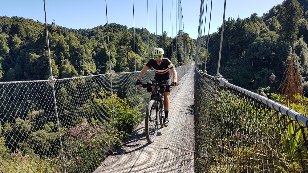 You can cross the swing bridge or stay on the same side, as the two tracks either side of the stream pass through the Mangaokewa Reserve and meet up at the Waiteti Viaduct car park by virtue of another bridge there. But apparently the true left bank track (the western side) is better maintained through to the reserve, so just stay with the bank you are on and cross a bridge at the reserve.