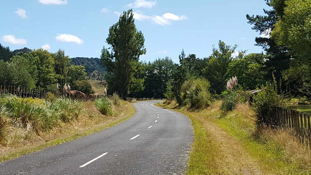 Continue on Kaimango Rd. It has almost no traffic but this changes when you get to the sealed Kāwhia Rd (SH 31) at Te Rauamoa. Turn left into it and walk for 2.7 km until you come to the unsealed Te Rauamoa Rd on the right as the main road turns west. Continue on Te Rauamoa Rd for 5.5 km to an intersection with Pekanui Rd on the right and Okupata Rd on the left. Go through the intersection in the same direction north on Pirongia West Rd for 2 km to the Omanawa Stream.