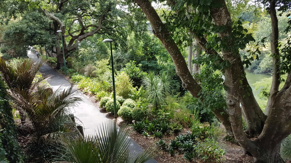 The trail ends at Norris Ward Park. Exit at the corner of Tristram and Ward streets, cross over Tristam and walk down Ward to its end and turn right into Worley Place, then left through Garden Place, between the two halves of the Centre Place shopping complex to Victoria St, the main street of Hamilton (known as Kirikiriroa in Māori). Turn left and head north for about 1 km to reach the backpacker accommodation area. If you are not stopping, cross Victoria St and do a slight dog-leg to go down a pedestrian way between the BNZ and Forsyth Barr buildings to Te Awa (aka River Walk or River Path, a very pleasant 8 km combined walk-cycle way) along the river that ends at Pukete Rd. Actually, even if you are planning to stay in the backpacker area of Hamilton you could still take the River Walk and pop back up to Victoria St at Rostrevor St (or before that at London St, which has toilets on the corner with Victoria St).